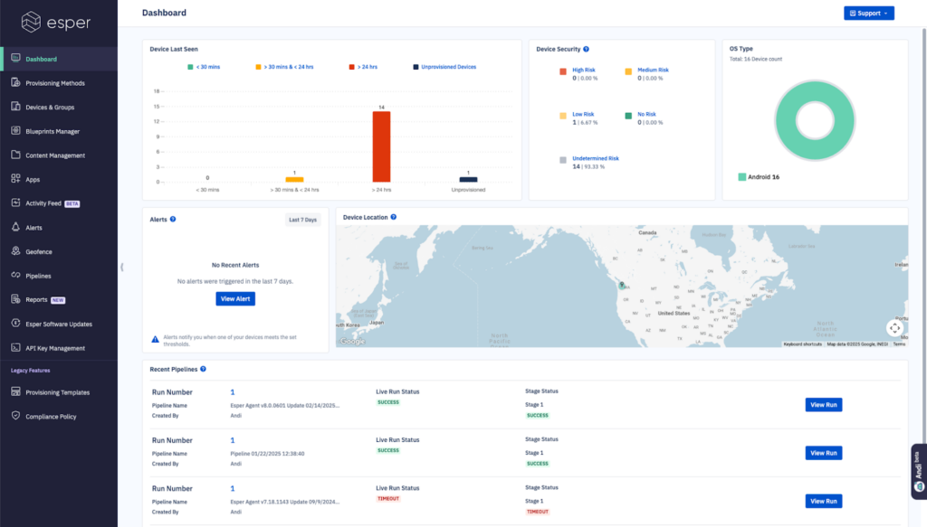Using Esper, IT teams can troubleshoot issues remotely using live access, logs, and diagnostics, reducing the need for on-site intervention.