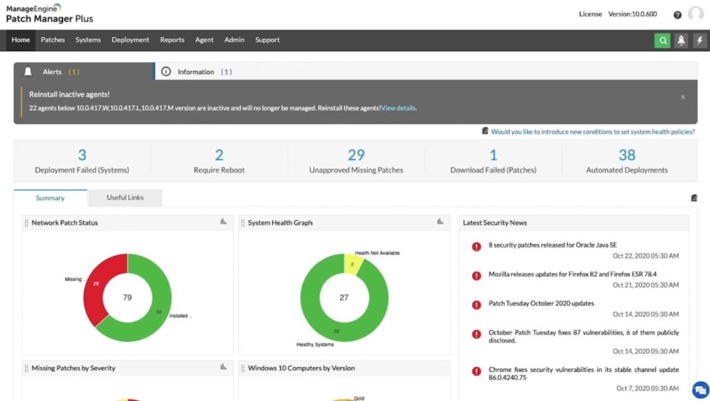 ManageEngine Patch Manager Plus is a cross-platform patch management solution that supports Linux, Windows, and macOS. It automates patch detection, deployment, and reporting from a centralized dashboard. The platform also supports third-party application updates, making it an all-in-one patch management solution.