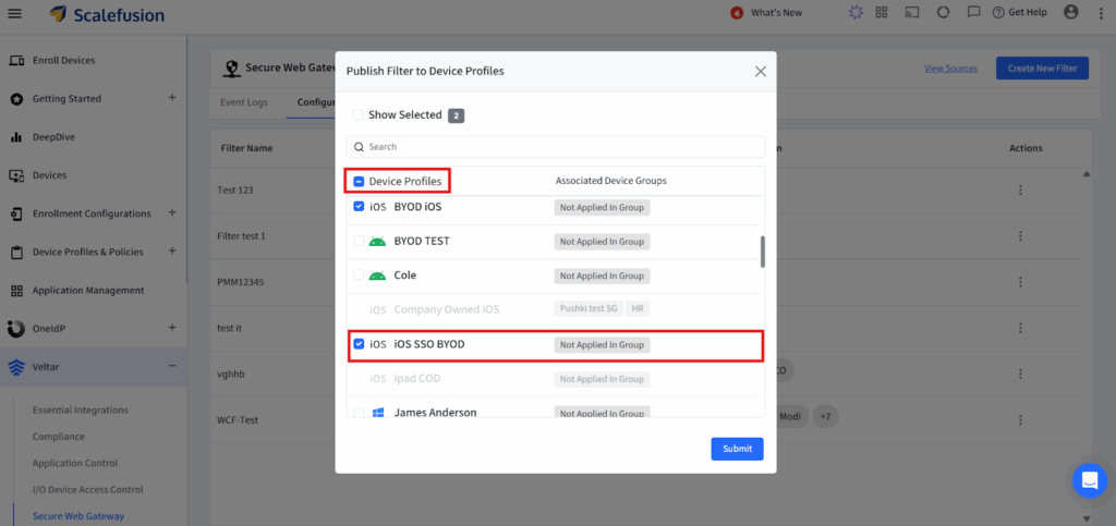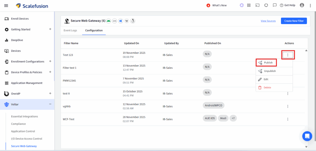 Zaloguj się do panelu Scalefusion, przejdź do panelu administratora Scalefusion i uzyskaj dostęp Weltar W sekcji wybierz Bezpieczna brama internetowa i kliknij „Utwórz nowy filtr” w prawym górnym rogu, podając unikalną nazwę.
